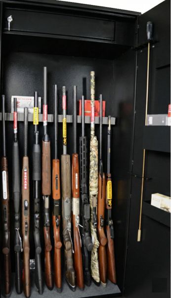 Armoire à fusils, carabines avec lunettes, munitions et armes de poings