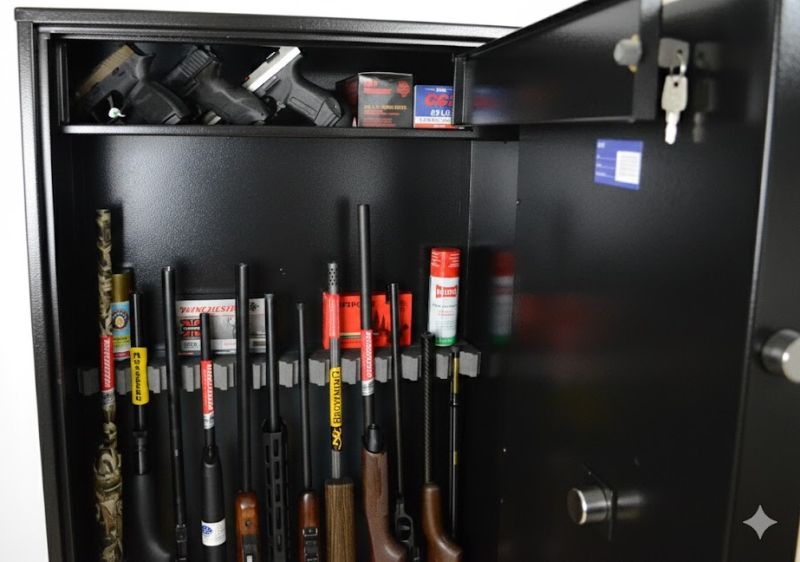 Armoire à fusils, carabines avec lunettes, munitions et armes de poings