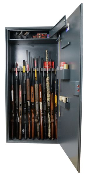 Armoire à fusils, carabines avec lunettes, munitions et armes de poings